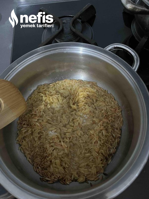 3. Tavaya zeytinyağı ekliyoruz üstüne arpa şehriyeyi ekleyelim.Pembeleşine kadar pişirelim.
