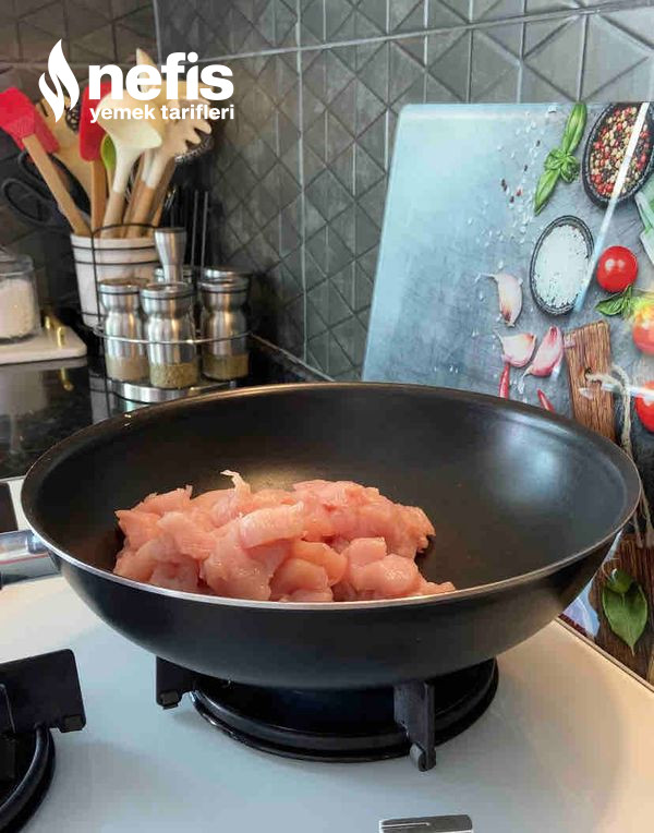 - Tavuk ile başlayalım, kuşbaşı doğranmış tavukları sıvı yağ döktüğümüz tavada soteleyerek pişirmeye başlayalım.