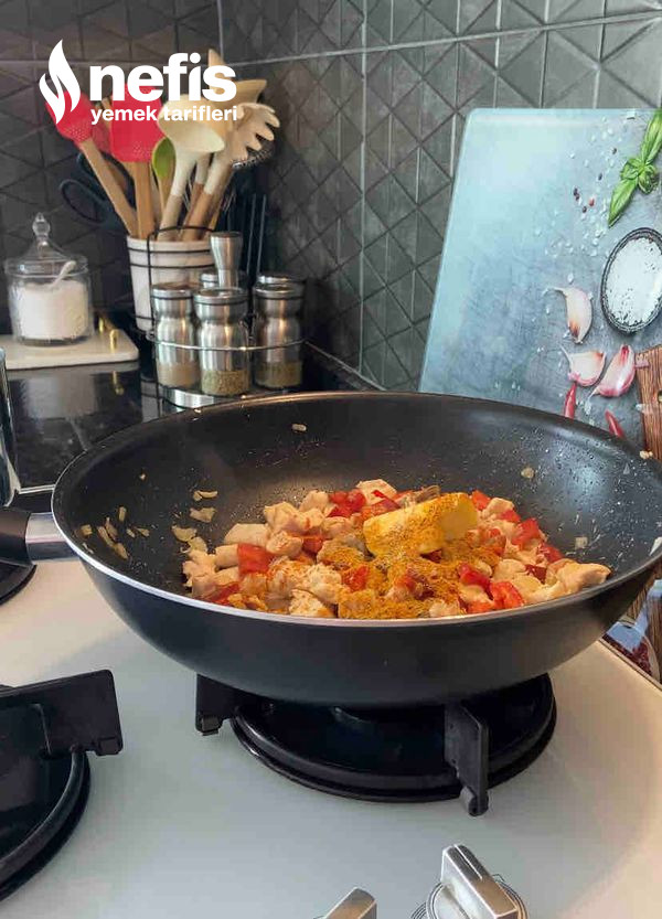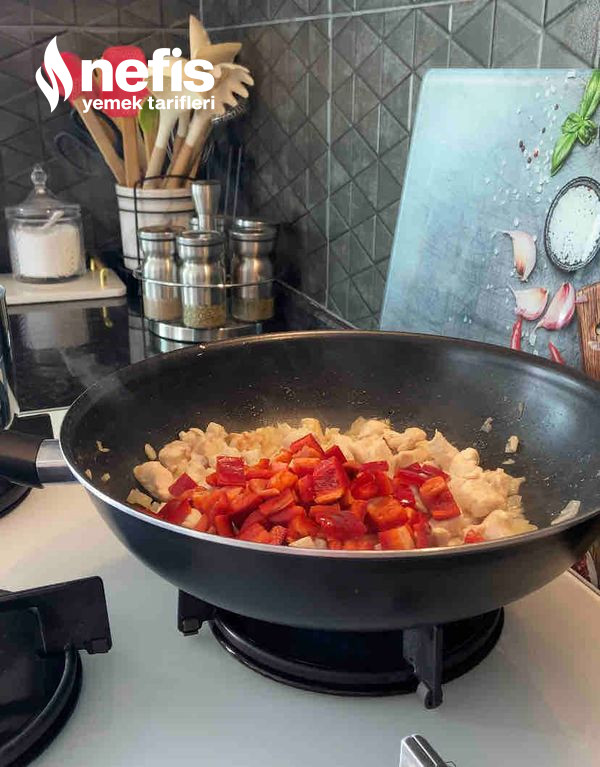 - Tavuklar pişince yeniden küp formunda doğradığımız kapya biberleri, tereyağını ve baharatları ek ederek birkaç çeşit daha çevirdikten sonra altını kapatalım.
