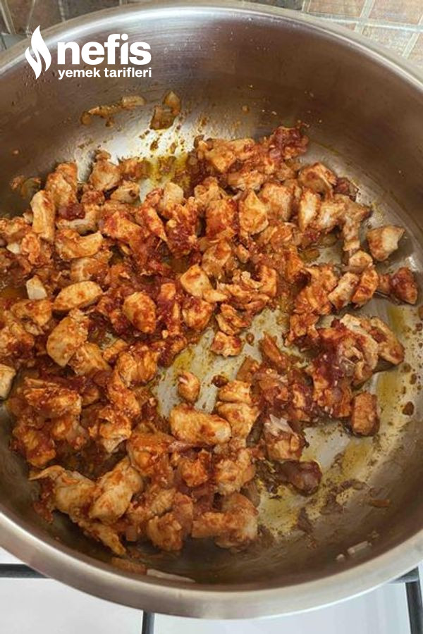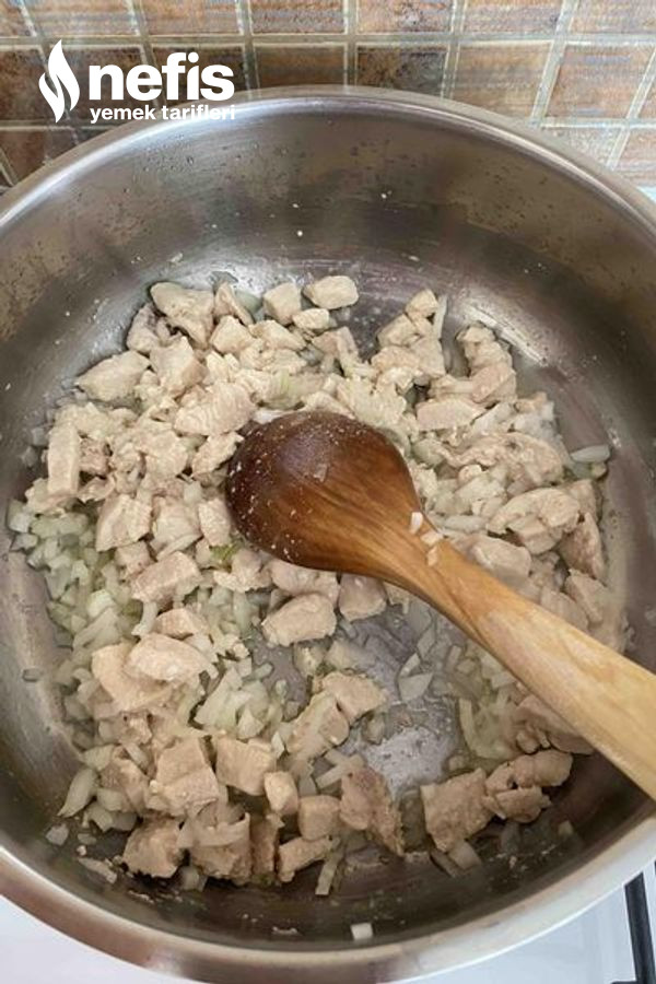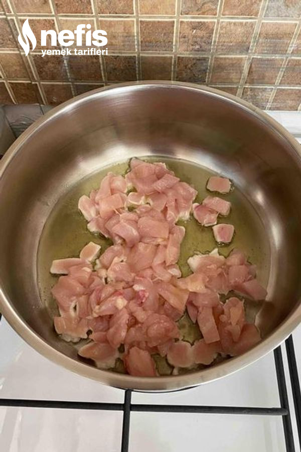 - Öncelikle tavuk göğsünü kuşbaşı formunda doğrayıp bir ölçü yağ ile suyunu salıp çekene kadar pişirelim.