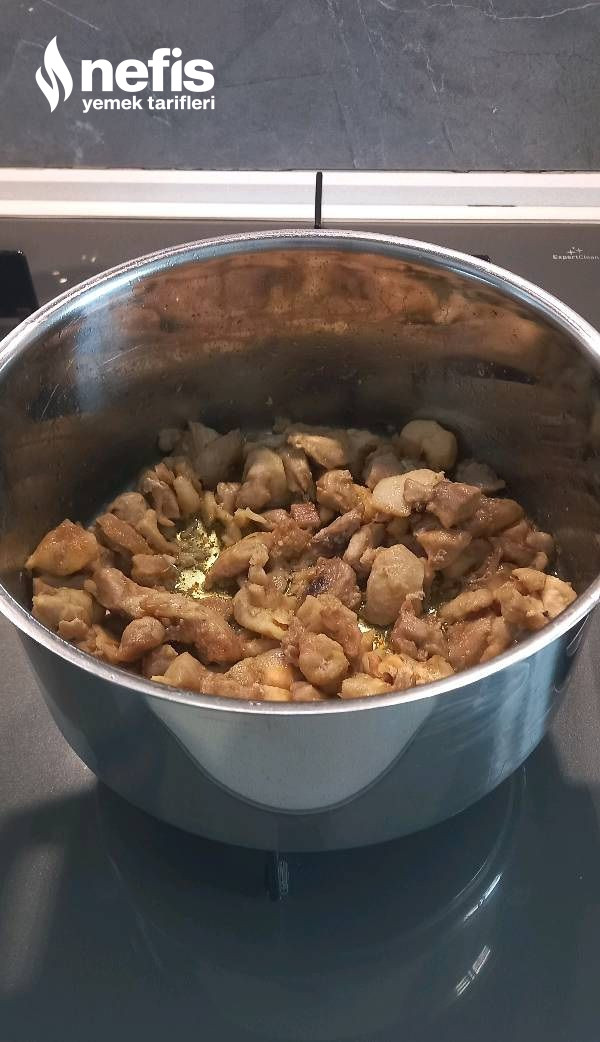 - Tencereye zeytinyağı ve üzerine kuşbaşı tavuk etleri alınır. Etler suyunu bırakıp tekrar çekince biraz kavrulur. Yemeklik doğranmış olan soğan ek edilir ve bir arada biraz daha kavrulur.