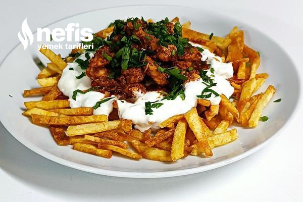 - Kızaran patatesleri tabağa alıp üzerine evvel yoğurtlu sos ,sonra salçalı sos en üstede tavukları koyalım. Afiyet olsun.