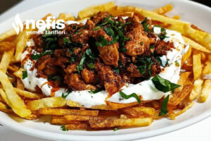 - Kızaran patatesleri tabağa alıp üzerine evvel yoğurtlu sos ,sonra salçalı sos en üstede tavukları koyalım. Afiyet olsun.