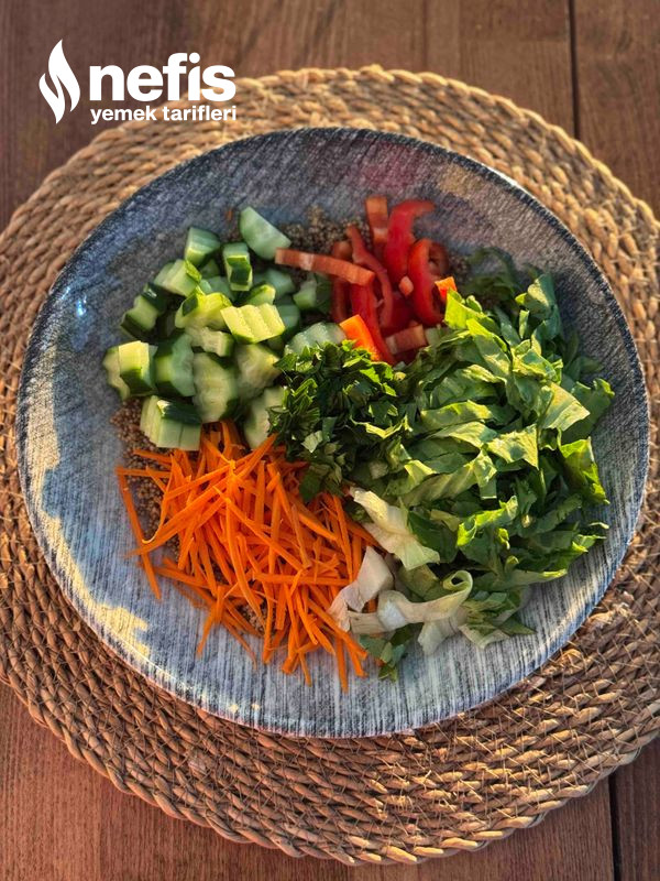 - Üzerine doğranmış sebzelerimizi ekleylim: salatalık, havuç, marul, kapya biber ve maydanoz.