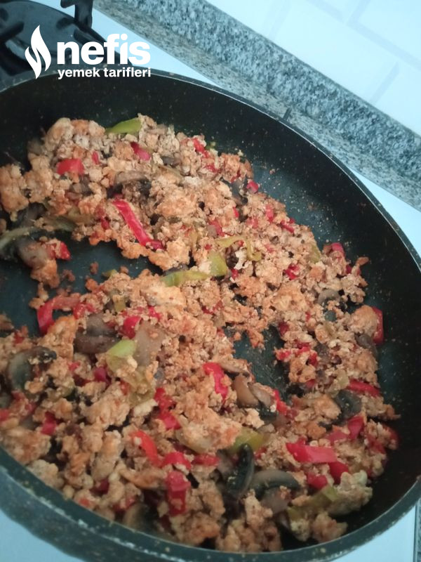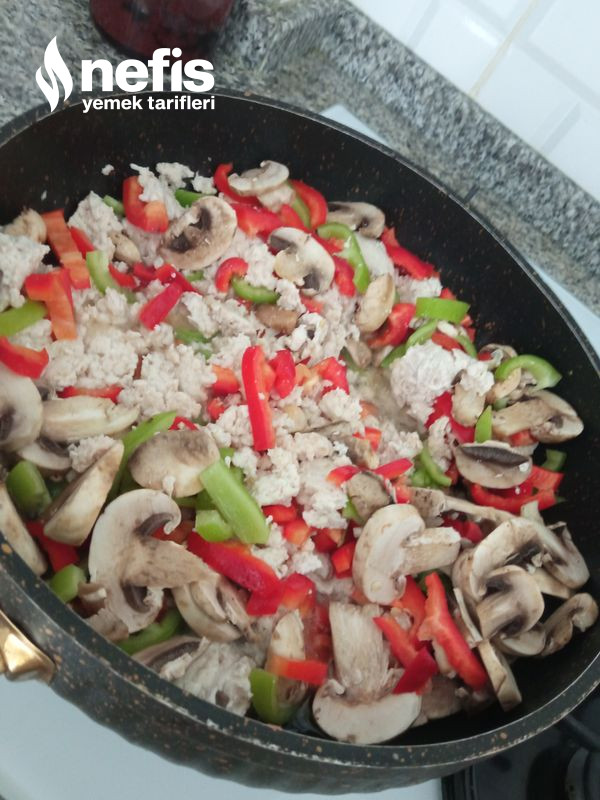 2. Yağımızı ekleyip mantar ve biberlerinizi de ekliyoruz.