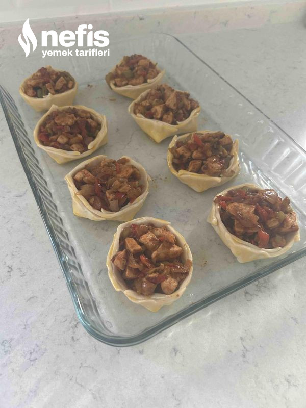 6. Tavuklu harcı milföy çanaklarına ikişer kaşık dökerek paylaştıralım 190° ısınmış fırında 30 dk. pişirelim fırından alalım.