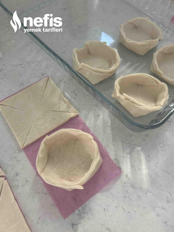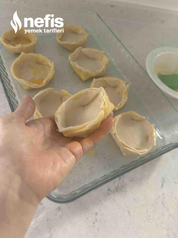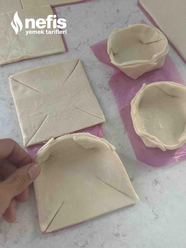5. Köşelerini birbirinin üzerine gerçek getirerek yapıştıralım çanakları oluşturalım. Milföy çanaklarına kenarlarına ve üst kenarlara gelecek formda yumurta sarısı sürelim. Fırın tepsisine çanakları sıralayalım.