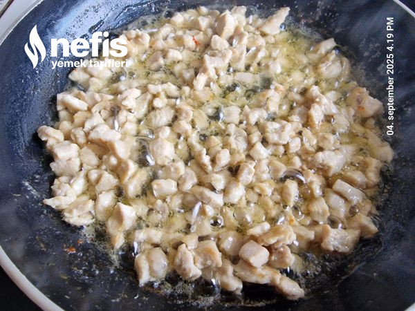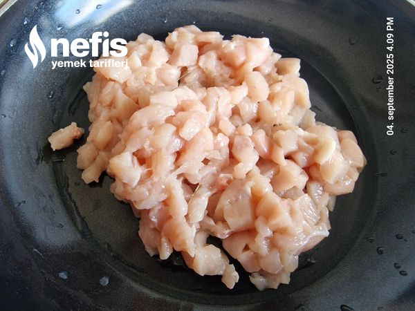 1. Tavuk küçük doğranarak tavada suyu çekilene kadar kavrulur.