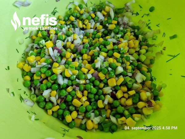 4. Haşlanmış nohut, mısır, bezelye ve hazır olan şehriye ve tavuk bir kaba konarak karıştırılır.