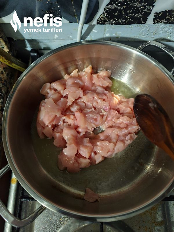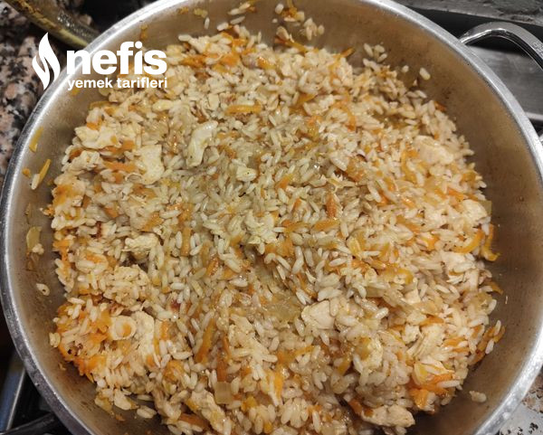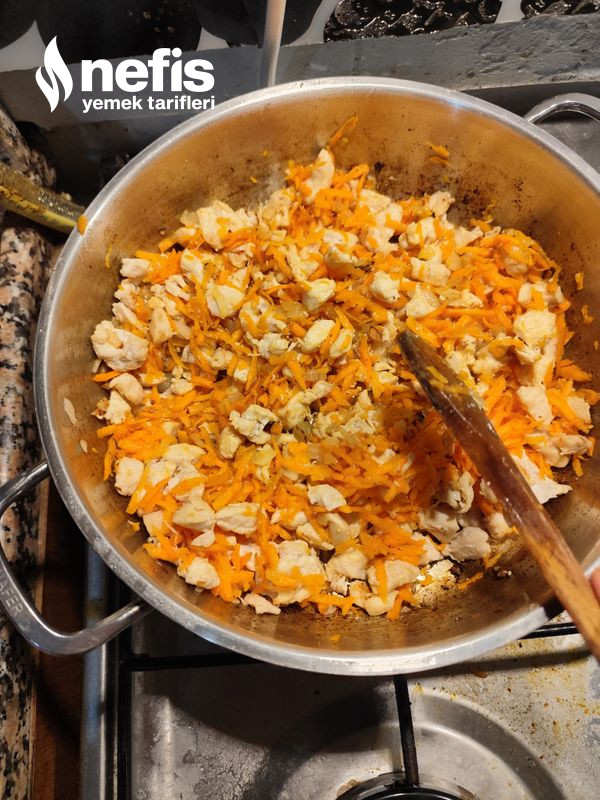 - Margarin eridikten sonra tavukları atalım, suyu çıkınca çekinceye kadar pişilelim ,sonra soğanları atıp kavuralım ,rendelediğimiz havucu atalım kavuralım.