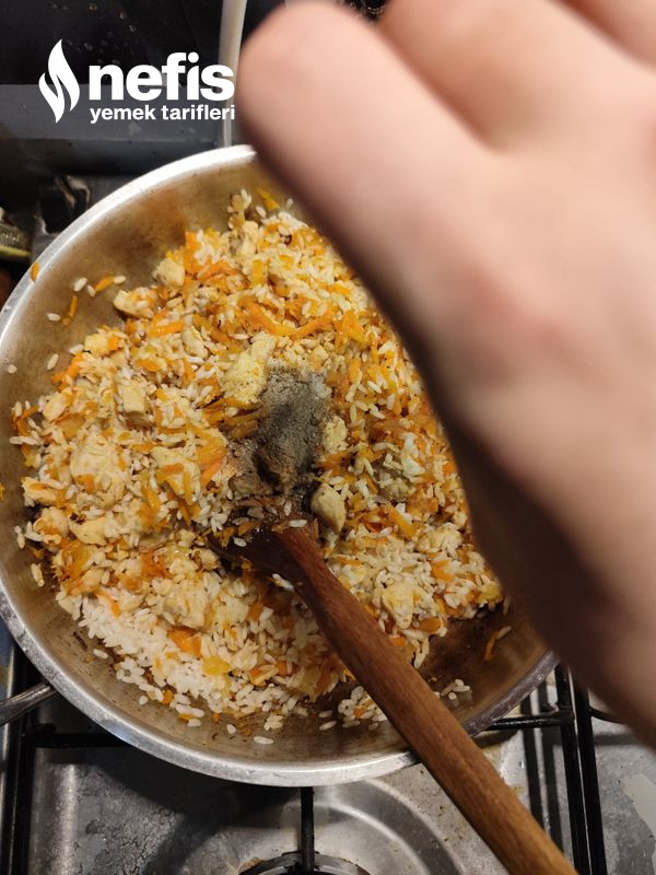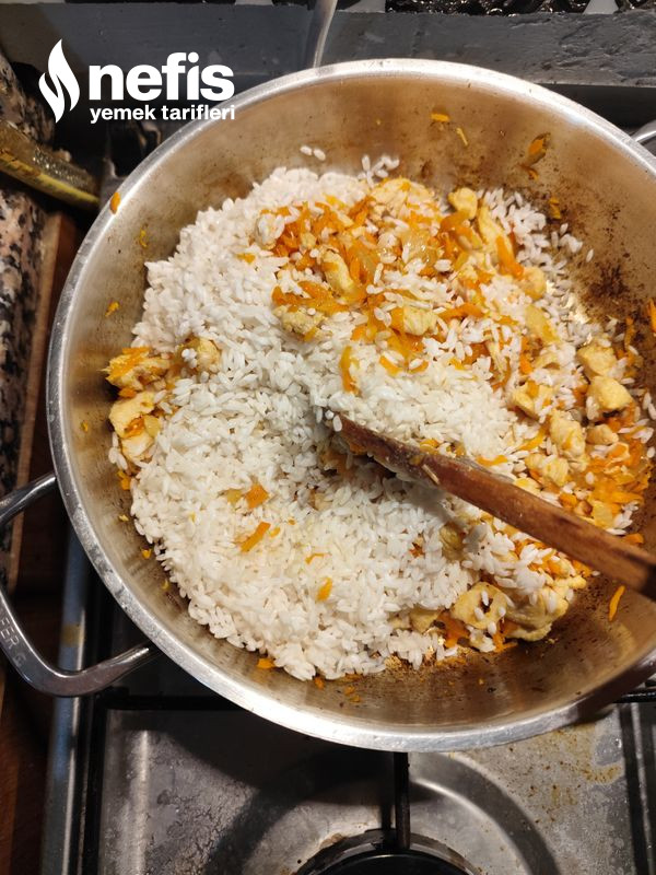 - Yıkadığımız pirinçleri süzelim ,kavurduğumuz tavuğun üzerine atalım karıştıralım.