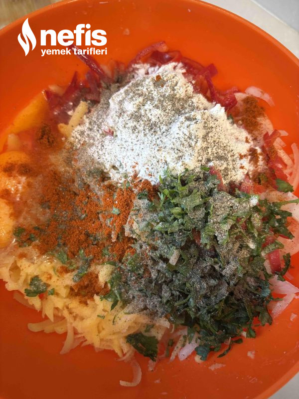 2. Patatesleri rendeledikten sonra kesinlikle suyunu sıkıp süzün bu suyu kullanmıyoruz döküyoruz, çukur bir kapta suyu sıkılmış patates rendesi ve doğradığınız gereçleri, üzerine yumurtaları, unu, baharat ve tuzu ekleyip güzelce karıştırıp, fırın tepsisine yağlı kağıt serelim.