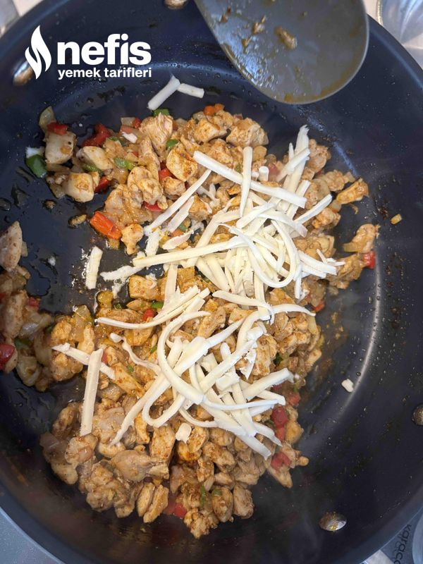 5. Önce tavuk etlerini koyup, suyunu bırakıp çekmeye yakın kuru soğanı ekleyin 3-4 dakika kavurup biberleri ekleyin 5 dakika kadar kavurun baharatları ve tuzunu ekleyin en son rendelenmiş kaşarı ekleyip karıştırıp eriyince ocağın altını kapatın.