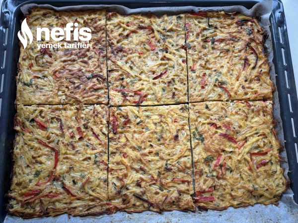 1. Öncelikle patatesli kısmını hazırlamak için kuru soğanı ince kıyım jülyen doğrayın, kırmızı biberi ince kıyım şerit olarak doğrayın, maydanozları ufak ufak doğrayıp patatesleri rendeleyin.