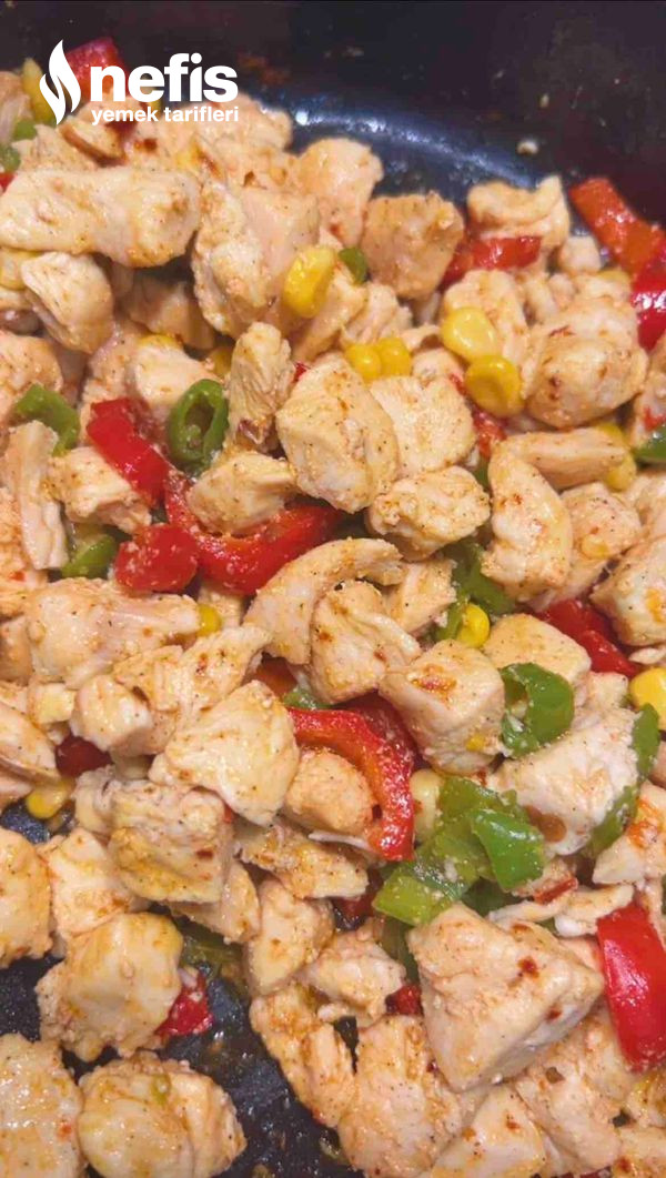 11. Pişen tavukların üzerine yemeklik doğranmış biberleri ve mısırı ekleyip karıştırın.