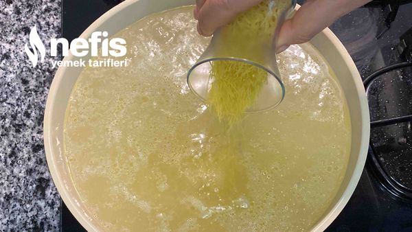 - Tavuk suyunu çorba tenceresini aktaralım kaynamaya başlayınca içerisine tel şehriye ve tuzunu ek edip karıştıralım.