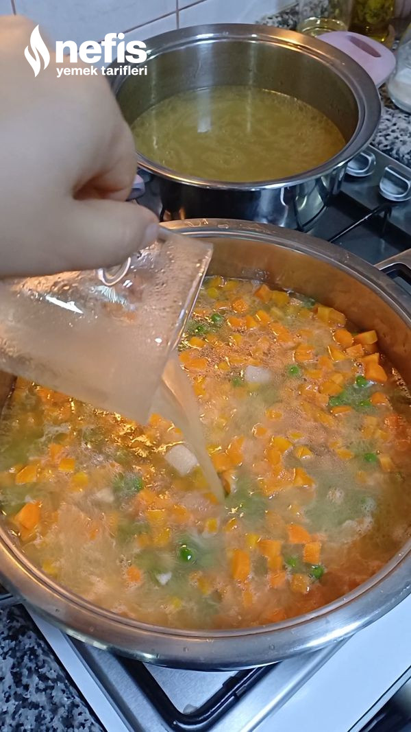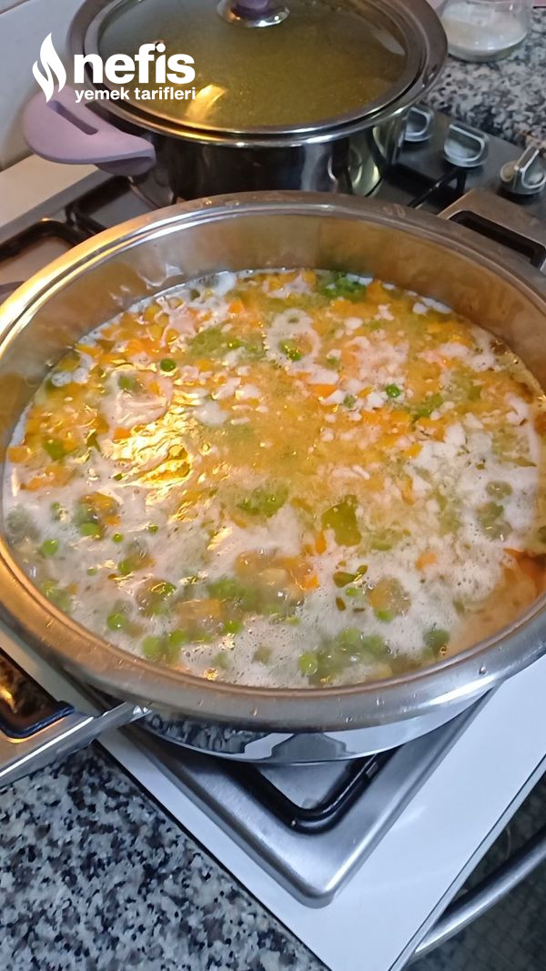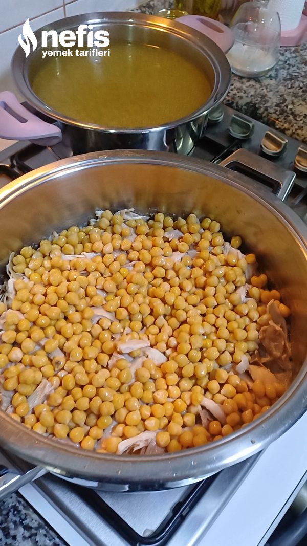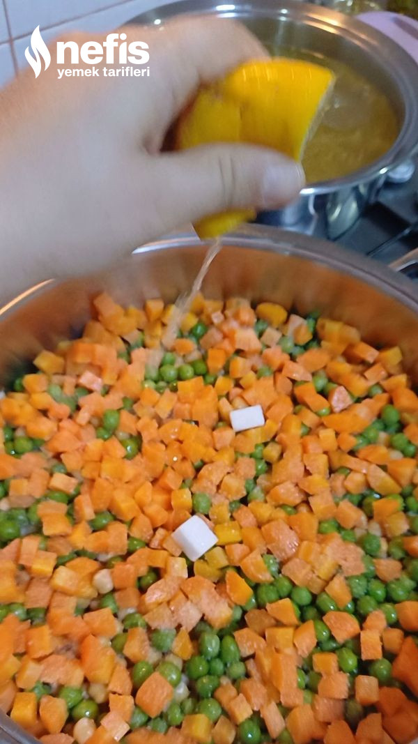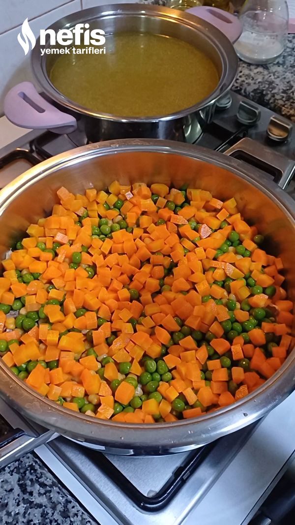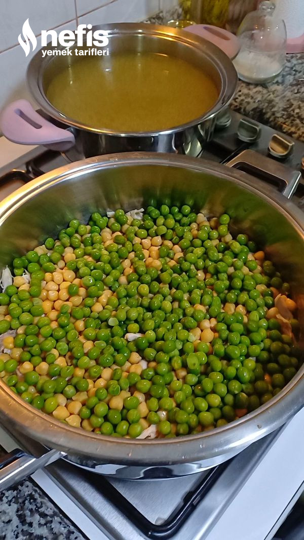 - Tencereye yağlar eklenir. Yağ eridikten sonra sırasıyla tavuk, nohut, bezelye, havucu ekleyin. Üzerine tuz, küp şeker ve limon suyu ekleyin. 6 su bardağı tavuk suyunu ekleyin kapağını kapatıp yüksek ateşte kaynamaya bırakalım.