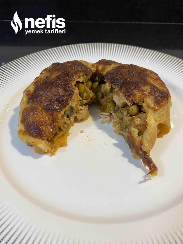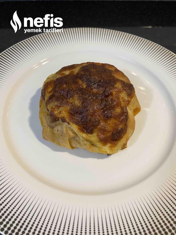 11. Üzerine tavuklu harçtan koyarak kasenin kenarlarından sarkan yufkaları üzerine kapatalım.