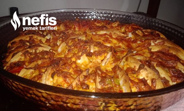 - Daha sonra üzerine rendelenmiş kaşar peynirini heryeri kaplayacak biçimde döktükten sonra 200 derecelik fırında yaklaşık 15 dakika pişiriyoruz.