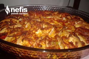 - Daha sonra üzerine rendelenmiş kaşar peynirini heryeri kaplayacak biçimde döktükten sonra 200 derecelik fırında yaklaşık 15 dakika pişiriyoruz.