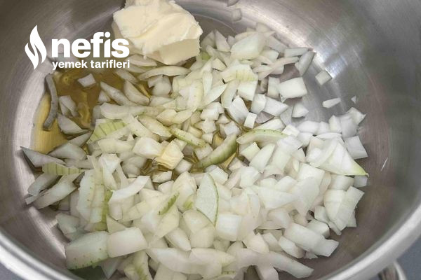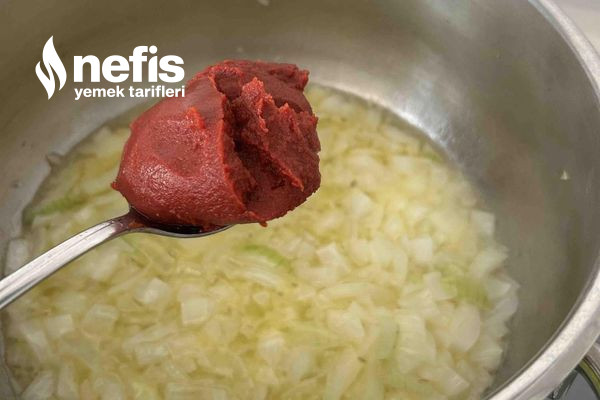 4. Tereyağı ve zeytinyağını ekleyelim, pembeleştirmeye başlayalım, pembeleşen soğanla bir yemek kaşığı salçayı ekleyelim kokusu uçana kadar kavuralım.
