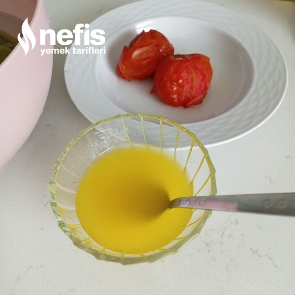 - Diğer tarafta domatesin kabuğunu soyup ince doğrayalım uygun bir kabın içerisinde ezilmiş sarımsak limon zeytinyağı ve tuzu karıştıralım.