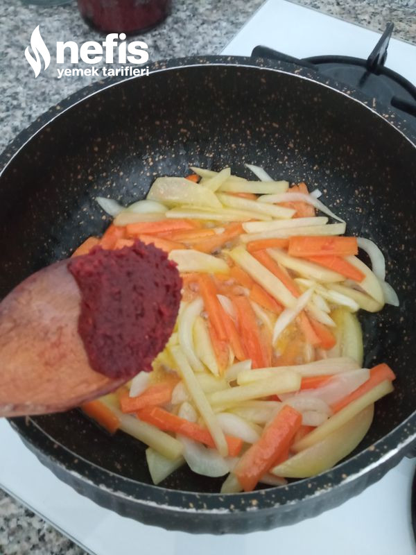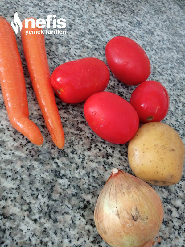 - Soğan patates sarımsak ve havuçlarımızı jülyen kesip zeytinyağında güzelce kavuralım.