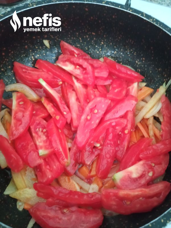 - Kavrulan sebzelerimizin üzerine salçamızı ekleyip domateslerimizi de atalım.