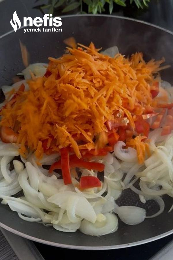 3. Soğanlar renk değiştirdiğinde rendelenmiş havuç ve ince uzun doğranmış kapya biberi de ekleyip kavuralım.