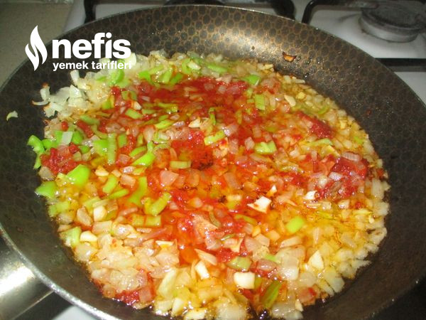 2. Diğer tarafta tavaya yağı koyalım, yemeklik doğranmış soğanı, sarımsağı koyalım bir dk kavuralım, sonra çekirdeği çıkarıp küçük doğranmış biberi ekleyip karıştıralım. Salçaları katıp, karıştıralım bir iki dk karıştıralım.