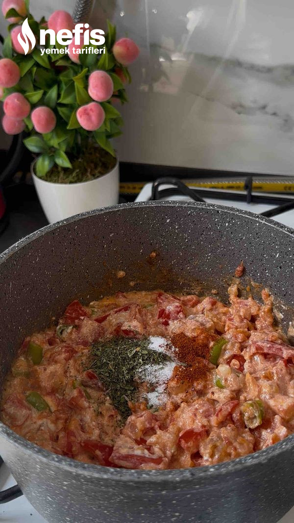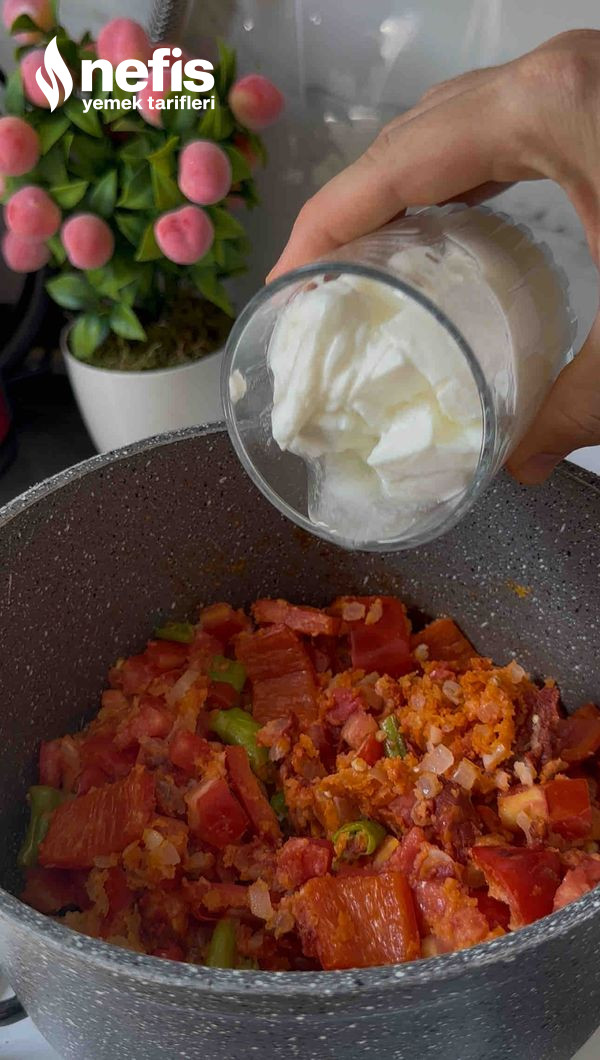 - Üzerine domatesi ekleyip az daha kavurup, salça, yoğurt ve baharatları da ekleyelim.