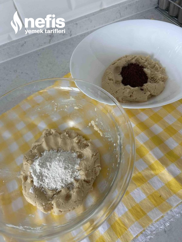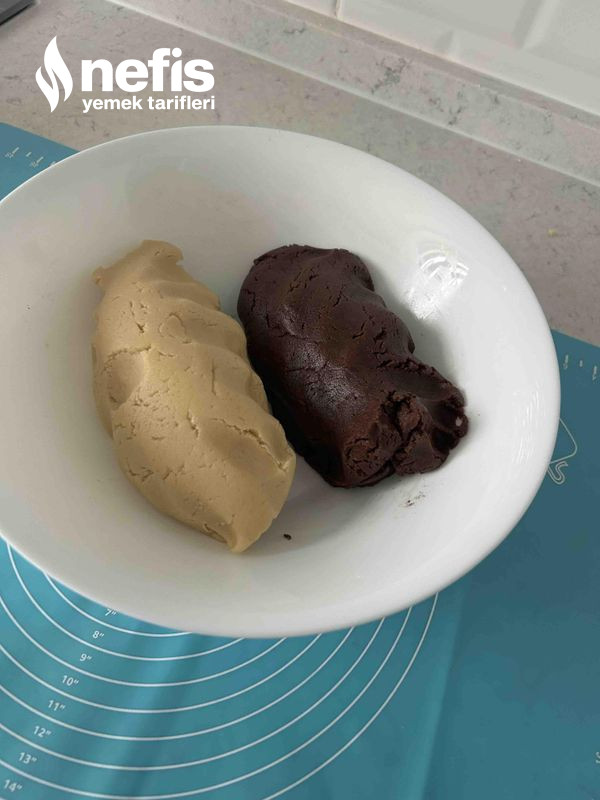 3. Unun evvel 4 su bardağını ekleyelim ,hamurun yumuşaklığına bakalım ve ikiye bölelim ,yarısına kakaoyu ekleyelim yoğuralım ,bu kısım artık kıvamlı hale gelecektir sade hamurunda yumuşaklığına nazaran kalan undan ekleyerek yoğuralım bildiğimiz kurabiye hamuru yumuşaklığında iki renk hamur elde edelim.