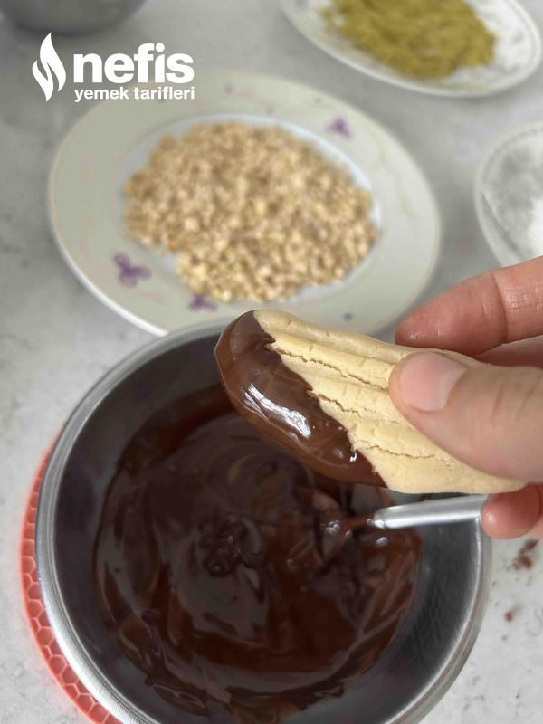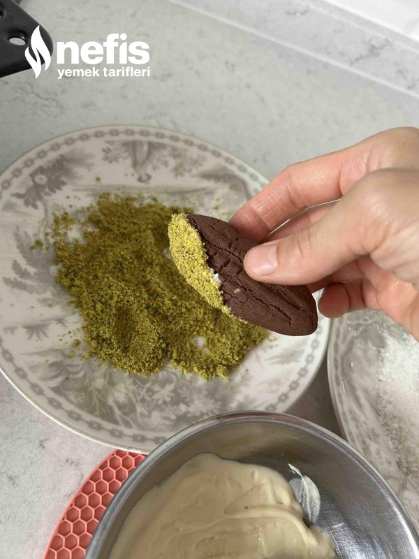 12. Diğer yandan süslemek için benmari adabı beyaz çikolata ve sütlü çikolatayı farklı kaplarda eritelim soğuyan kurabiyeleri kakaolu olanları beyaz çikolataya yeşil fıstığa, sade olanları sütlü çikolataya fındığı bandırarak aralıklı sıralayalım .