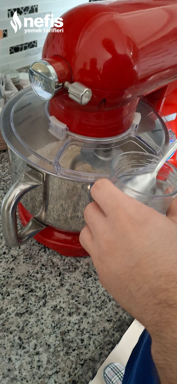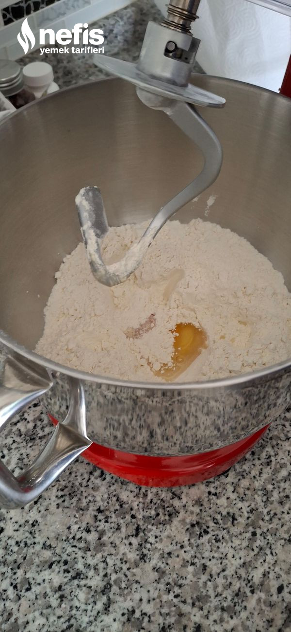 - Hamur makinasına un koyduktan sonra yumurtaları kırıyoruz. Suyun içinde tuzu erittikten sonra azar azar ekleyerek hamurumuzu yoğuruyoruz. Hamurumuzu en az yarım saat dinlendiriyoruz.