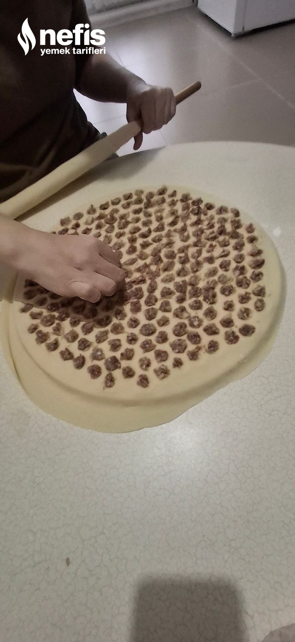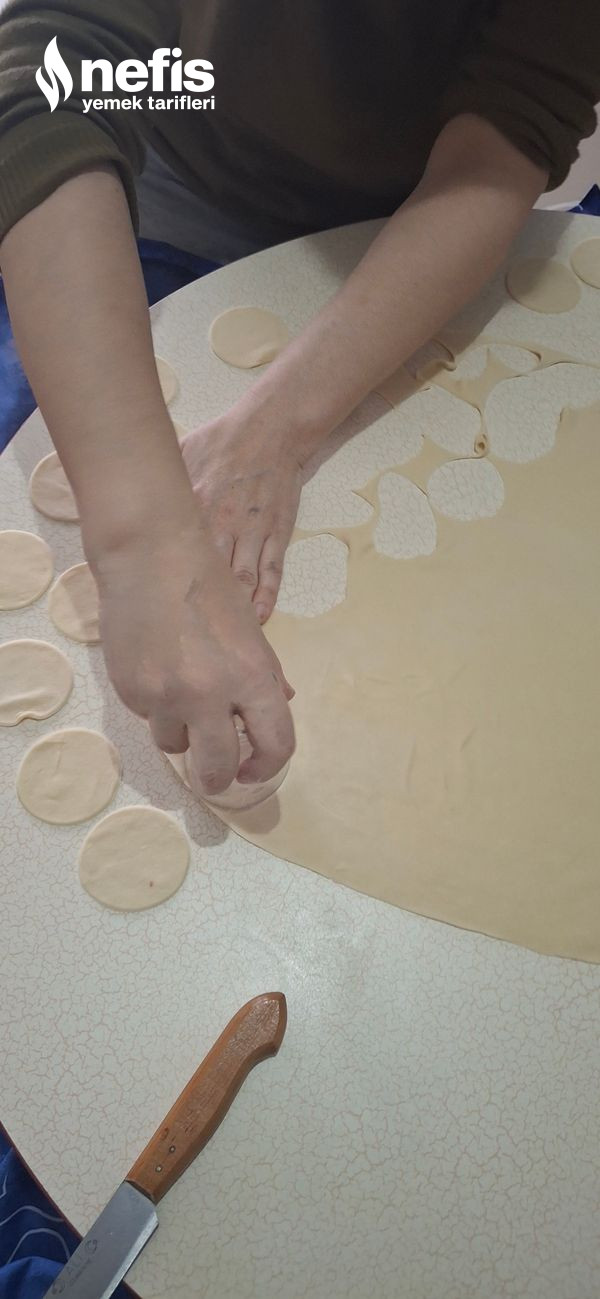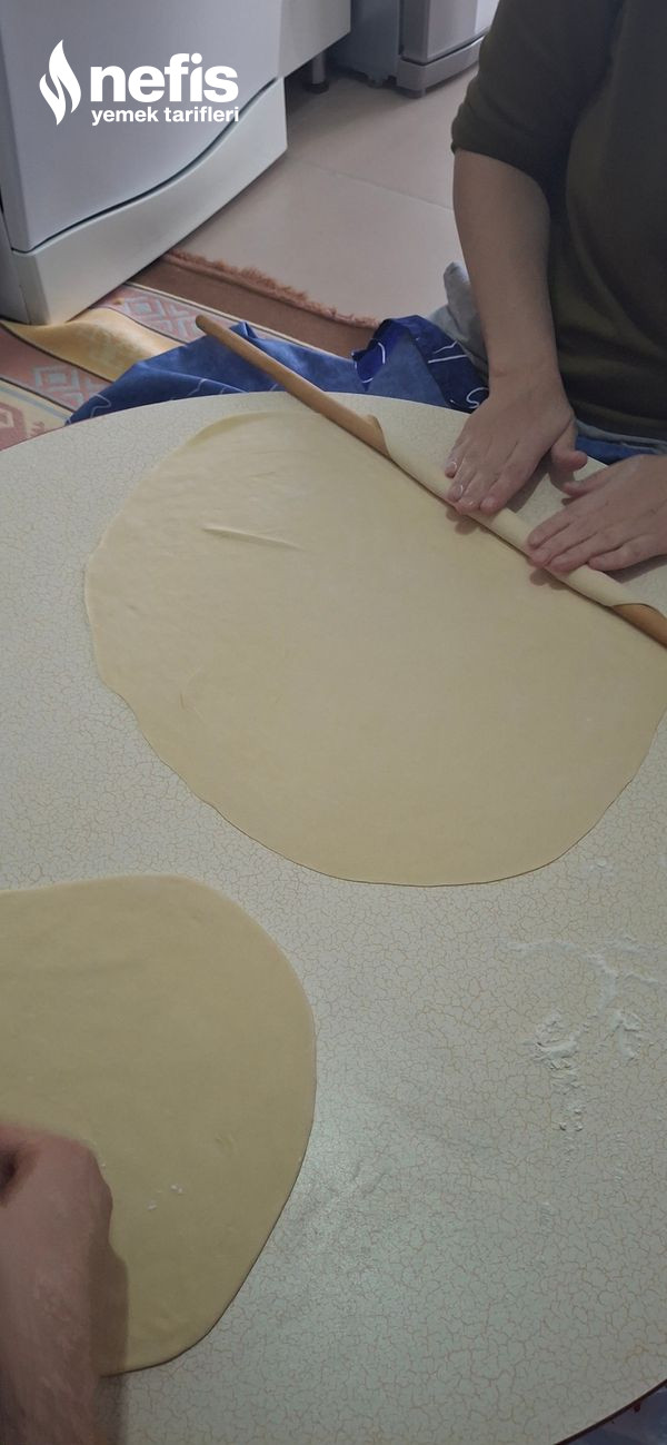 - Dinlenen hamurları 5 eşit bezeye bölüyoruz ve kâfi incelikte açıyoruz.