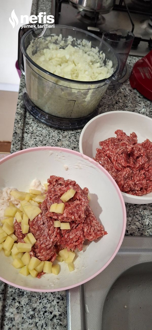 - Herhangi bir kaptaki kıymaya, çiğ patatesi küçük olacak formda doğradıktan sonra çekilmiş kuyruk yağıyla bir arada ekleyip damak tadına nazaran tuz ve karabiber ekleyerek karıştırıyoruz. (her iki kıymaya da tuz ve karabiber koyuyoruz).