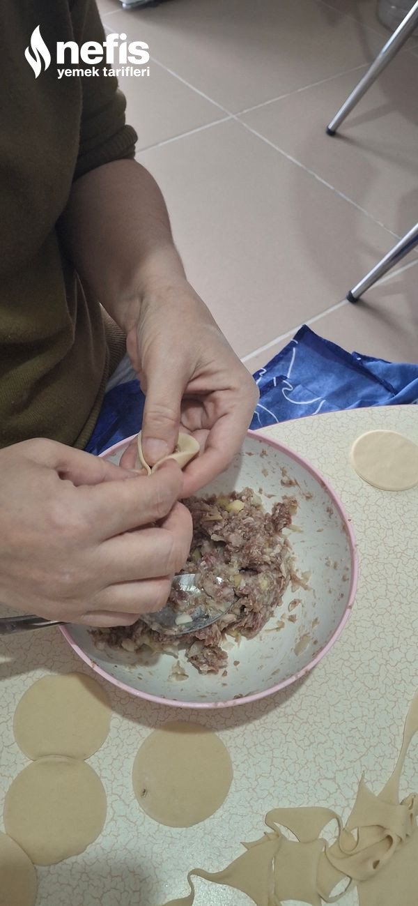 - Özbek mantısı için hamurları kare olacak formda kesip fotoğraftaki üzere formda veriyoruz. Psihalive için hamuru su bardağı ile kesip yaptık.