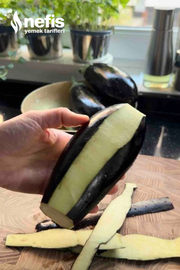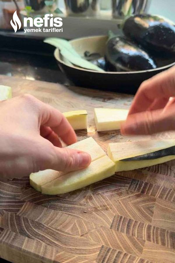 • 3 adet patlıcan (alacalı soyulmuş, şeritler halinde kesilmiş ve ortadan ikiye bölünmüş)