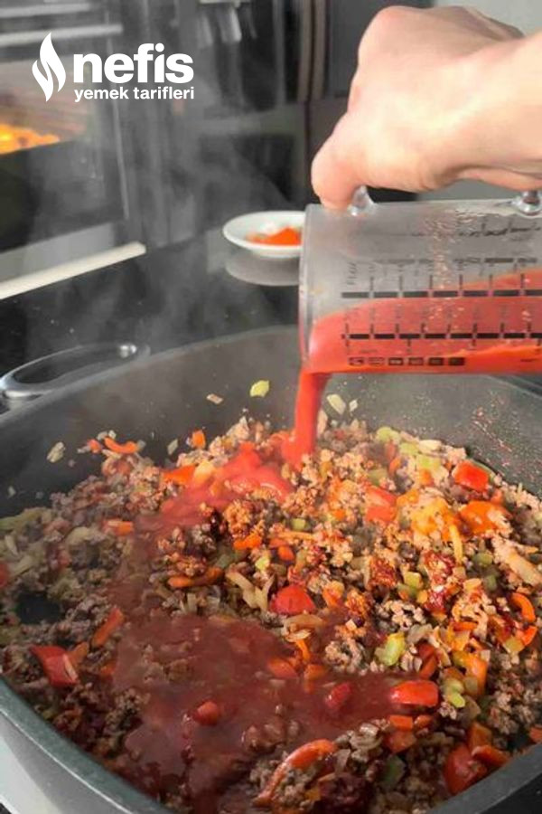 2. Geniş bir tavada zeytinyağını ısıt. Soğanı ve yeşil ile kırmızı biberleri ekleyip yumuşayana kadar kavur. Kıymayı ekle, suyunu salıp çekene kadar karıştırarak kavur. Biber salçasını ekle ve kısa müddet birlikte kavurmaya devam et.