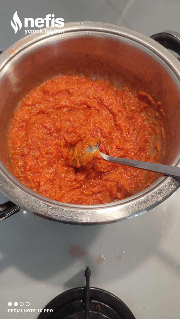 3. Daha sonra kabuğu soyulmuş domatesleri rendeleyelim domates sosunu baharatı ve salçayı ekleyip karıştıralım.