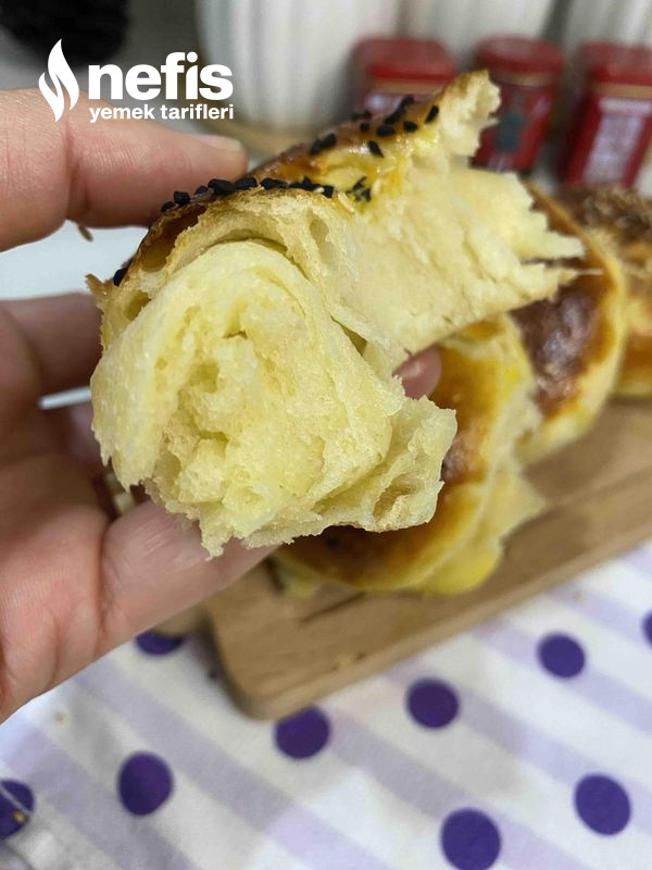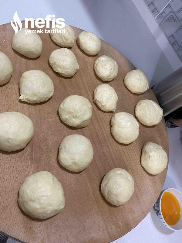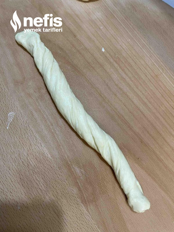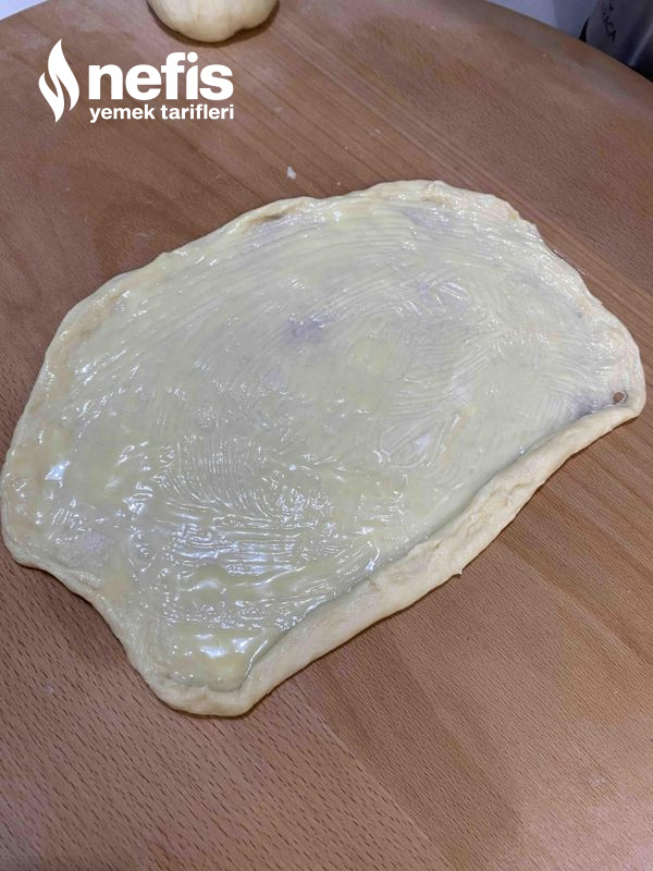 - Mayalanan hamurumuzu alıp tekrar 2 /3 çeşit yoğuralım mayasını alalım yumurta büyüklüğünde eşit biçimde kesimlere ayıralım ve elimizle açmaya çalışalım açtığımız hamurumuza hafif erimiş tereyağ sürelim ve rulo biçiminde saralım .