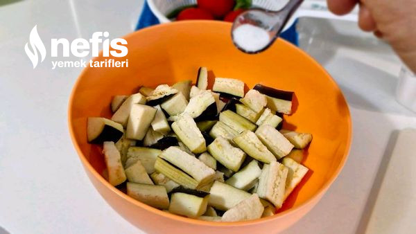 - Öncelikle patlıcanları derin bir kabın içine (fotoğraftaki üzere )doğrayın.