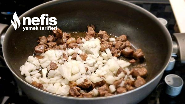 - Ardından kuru soğanı ek ederek 1 dakika etle birlikte kavuralım.