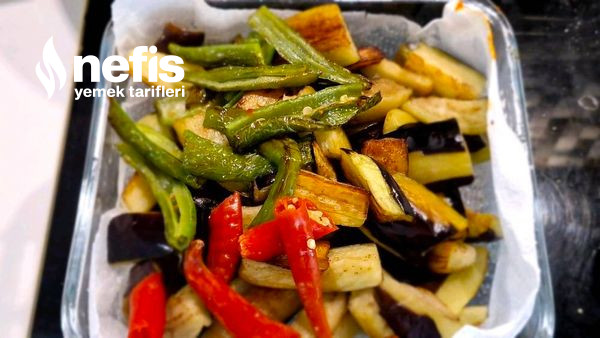 - Kızartılmış patlıcan ve biberleri ekleyelim.