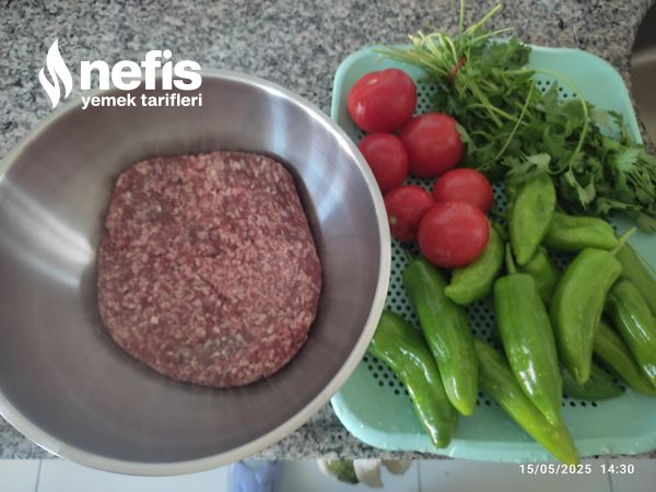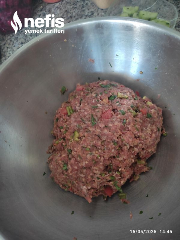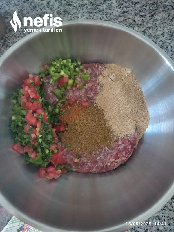 3. Kıymayı derin bir kaba alıp, doğranmış gereçleri ,baharatları ekleyip düzgünce yoğuruyoruz.
