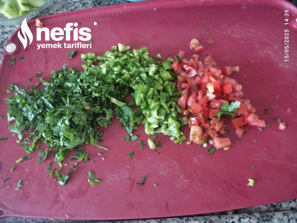 2. Maydanozu ayıklayıp domates biberler ile küçük küçük doğruyoruz.
