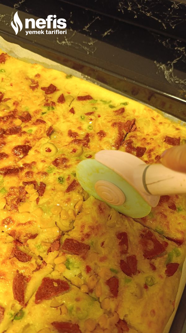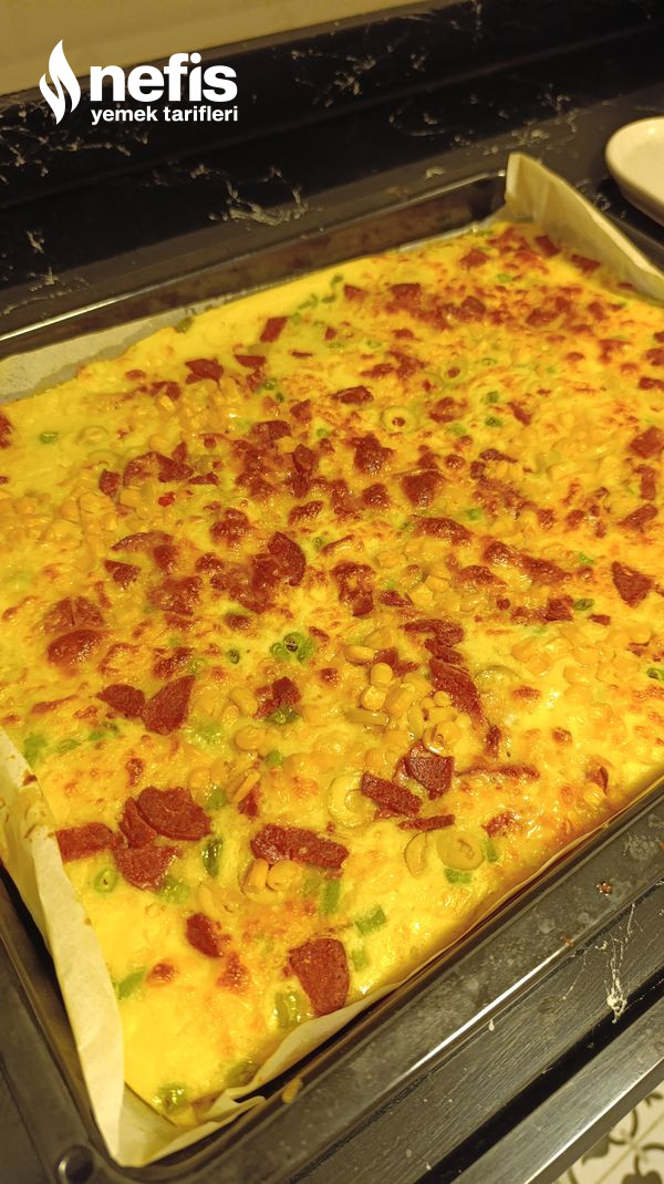 - Üzerine kaşar peyniri, sucuğu, yeşil biberleri, kaşar peyniri, zeytini, konserve mısırı serperek 220 derece fırında 20_25 dk pişiriyoruz. Afiyet olsun👌😋🤗