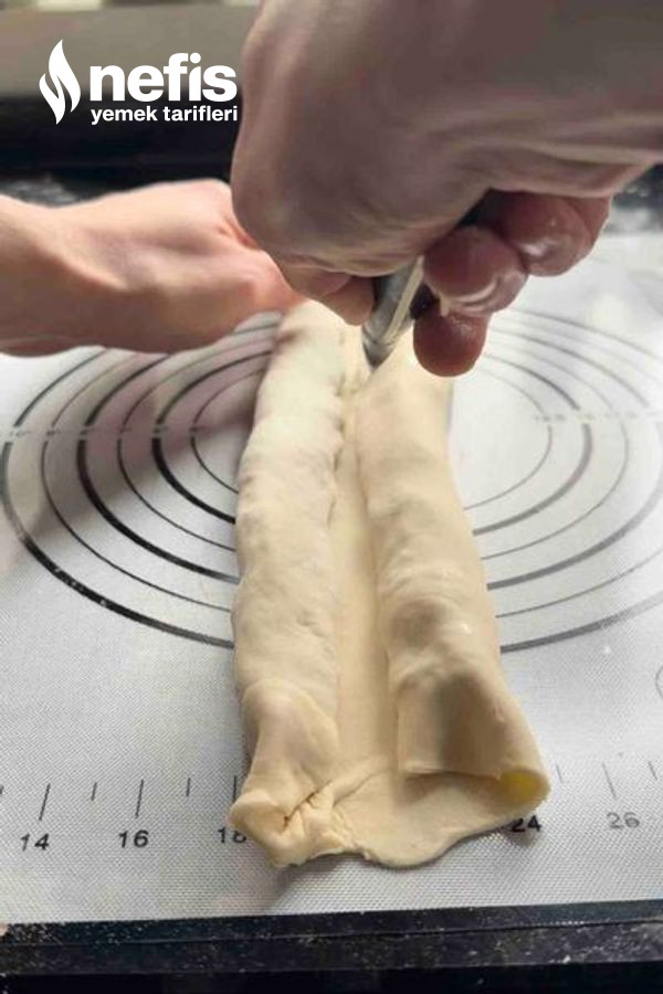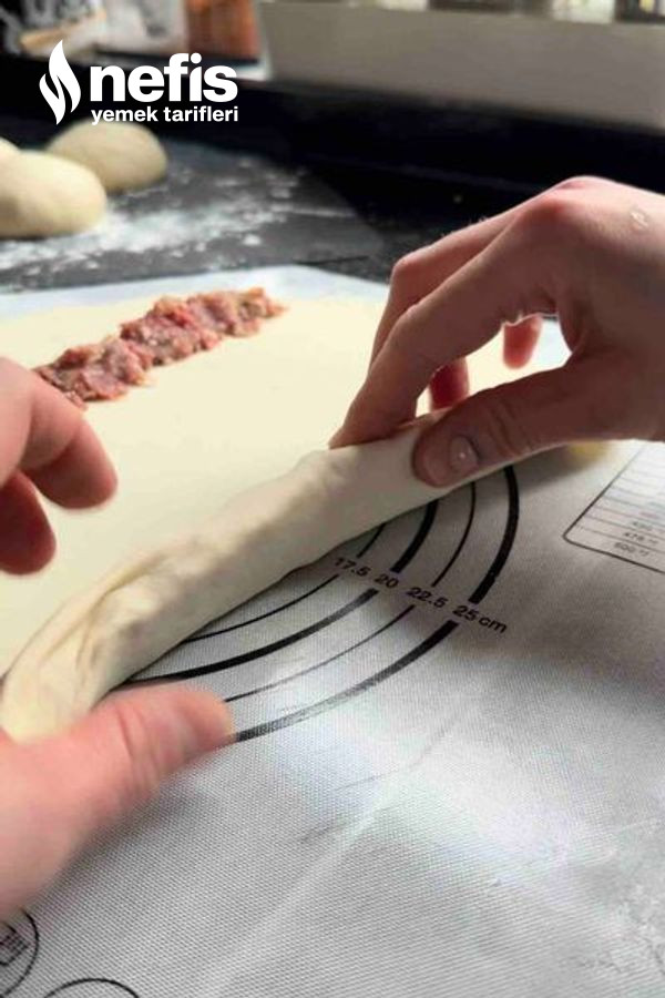 - Kıymalı harcı hamurun sağ ve sol uzun kenarına yayın.