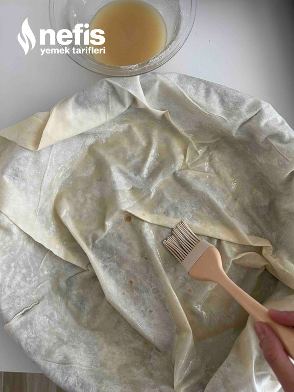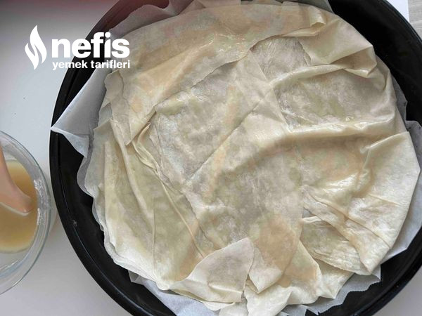 3. Yağlı kâğıt serilmiş tepsimize birinci yufkayı koyup sosumuzu sürelim, bir kat daha yufka koyalım tekrar sosumuzu sürelim ve iç harcımızı güzelce yayalım.