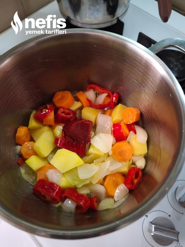 - Daha sonra patates, havuç,kabak ve salçayı da ekleyip bir iki dakika daha kavuralım.